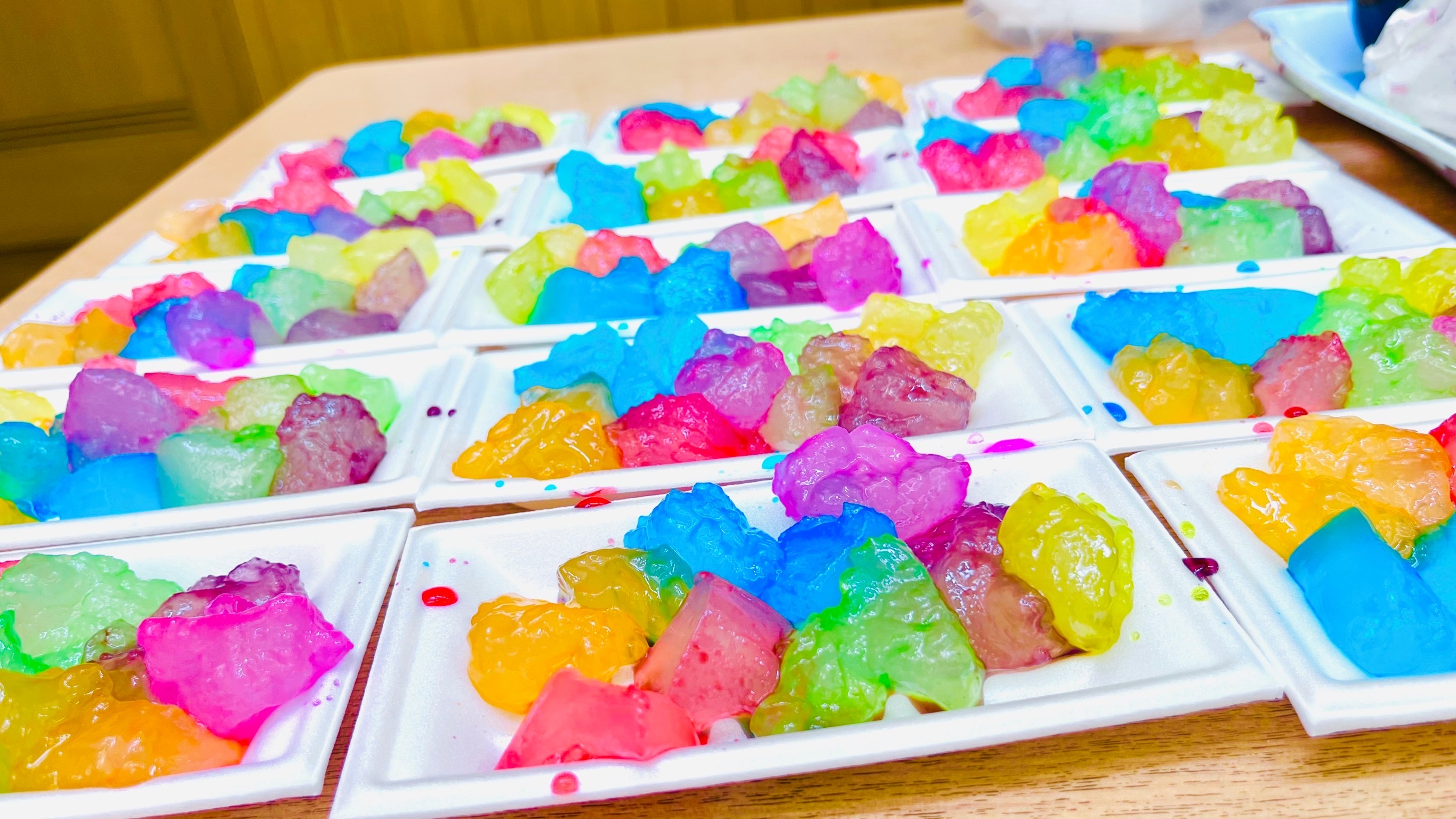 赤や黄色などいろんな色のシロップに漬け、カラフルに仕上がりましたemojiemoji