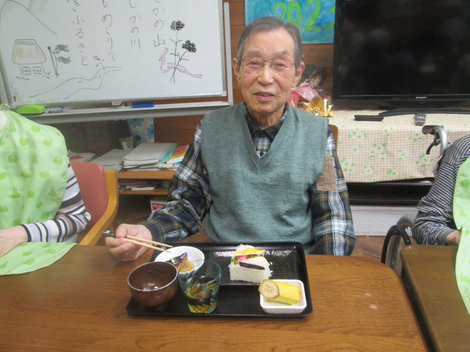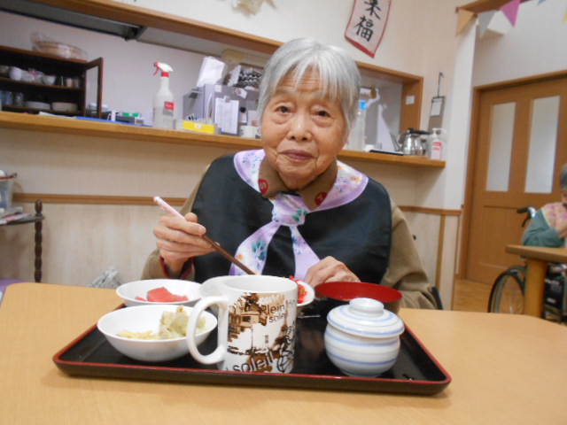 食事会ということで、利用者様に職員手作りのちらし寿司、天ぷら、茶碗蒸し、すまし汁を召し上がっていただきましたemoji